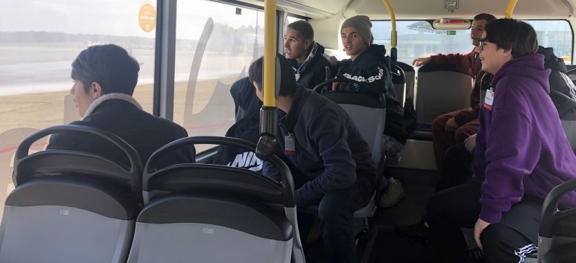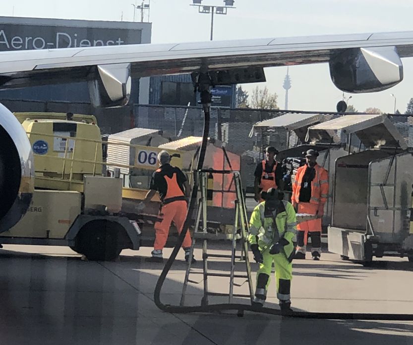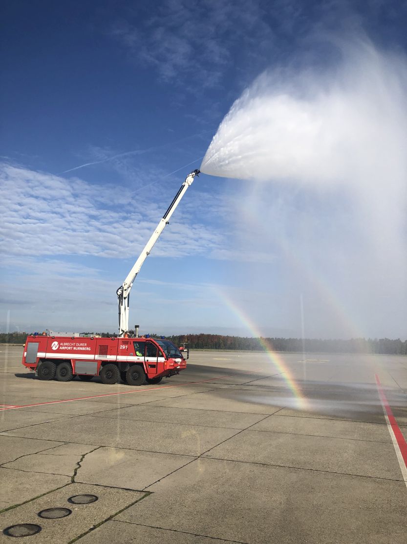Nachdem die Klasse mit dem Zug und der U-Bahn angereist war, mussten alle zuerst einmal durch die Sicherheitskontrollen. Da ging die Spannung schon los. Natürlich piepste bei zwei oder drei Personen die Schleuse. Sie wurden nochmal extra abgescannt und durften letztendlich in den Sicherheitsbereich. Von dort aus ging es sofort mit dem Bus auf das Rollfeld. Unser Guide, der schon im Tower gearbeitet hatte, gab uns einen exklusiven Blick hinter die Kulissen. Zunächst landete eine riesengroße Transportmaschine der US-Army, die sich zu zwei weiteren im hinteren Teil des Flughafens befanden. Am Boden sahen wir den FCN-Flieger, was manche Schüler begeisterte. Gespannt verfolgten wir als eine Ryanair ihren Landeanflug abbrach und wieder durchstartete, um aus irgendwelchen Gründen später zu landen. Die hauseigene Feuerwehr öffnete nur für uns ihre Pforten und führte eine Löschübung mit einem Fahrzeug durch. Der Notfall-Heli startete zu einem Einsatz und zwei Privatjets sowie Urlaubsflieger starteten. Des weiteren sahen wir wie ein Linienflieger betankt wurde, welche Flugzeuge von privaten Stars und Sternchen im Hangar von Aero-Club Nürnberg stehen, die riesigen Treibstofftanks, den Tower, von dem aus alles geregelt wird und das Frachtzentrum. Am Ende der Führung gab der Tower für uns alleine noch die Startbahn frei und wir durften mit dem Bus wie ein Flugzeug mit der entsprechenden Beleuchtung entlang fahren. Am Ende der Flughafentour schauten wir uns noch im Terminal um.